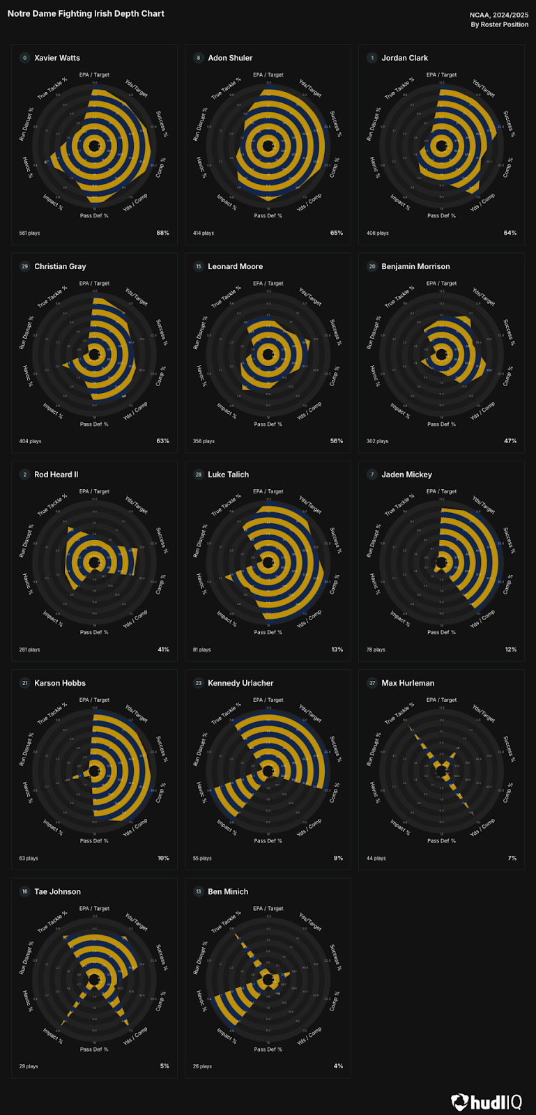 Notre Dame primarily plays man coverage, but what type of man? Cover 0, Cover 1, Cover 2 man? I open up the coverage section details to find out more, and it looks like 89% of their man coverage plays are cover 1. Over half of their zone coverages are cover 3, so we can expect a lot of middle of the field closed coverages. Whenever a team plays a lot of zone, one of the first areas to study is if there are defensive backs who are particularly effective in man coverage, or potential weak spots to target. As a side note, I would try to avoid being forced to throw if at all possible against their DB’s.