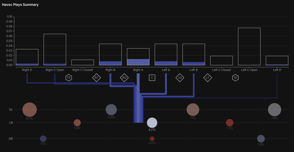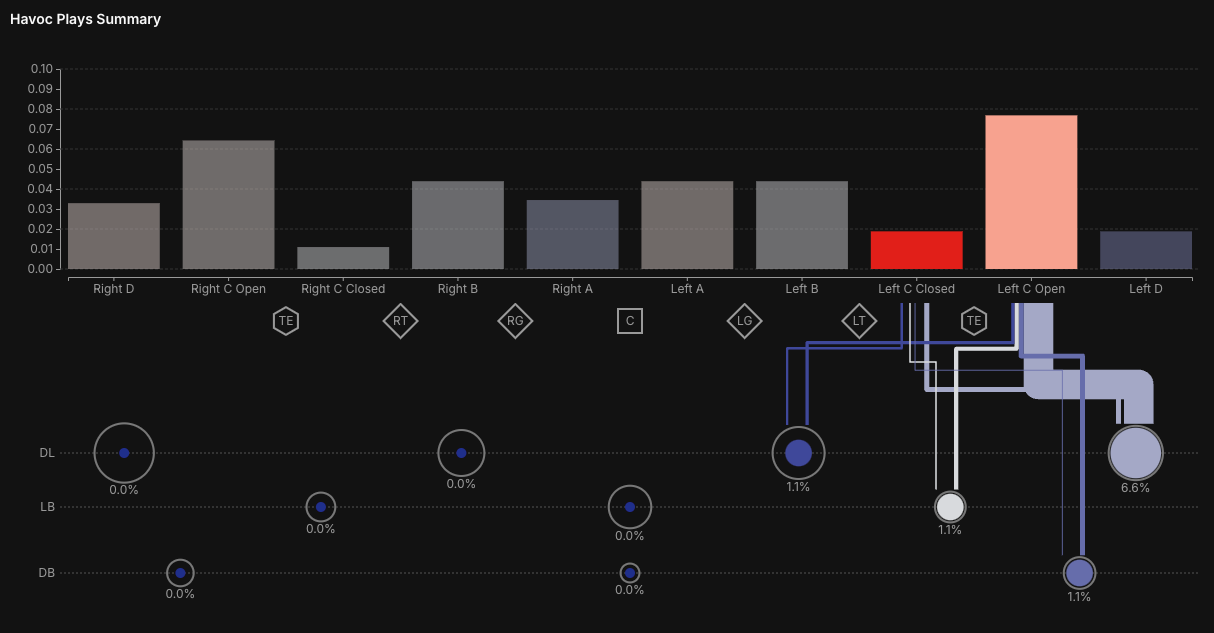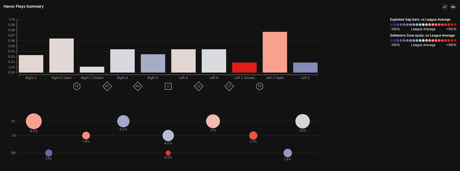 The bars and dots are color coded by comparison to league average with red being more than national average, and blue being less than national average. So in Notre Dame’s case, they are better than the national average, creating havoc in the left C gap (open and closed with a Tight End). They also create more havoc with their wide left DL, central right DL, Both Outside Linebacker sides, and central DB area.