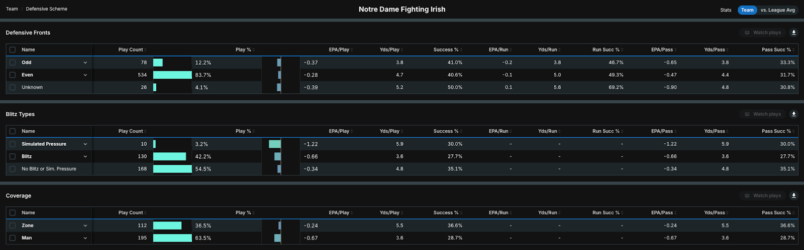As mentioned above, the first step in breaking down an opponent is finding out the overall scheme of an opponent. Our new defensive scheme page does just that! Below you will find a screenshot from our defensive scheme tool for Notre Dame. The Fighting Irish have been one of the best defenses the past two seasons. They are currently 1st in passing EPA/play against, 1st in CPOE defense, 2nd in EPA/play, 3rd in explosive plays against, 4th in yds/play, I could go on and on.
