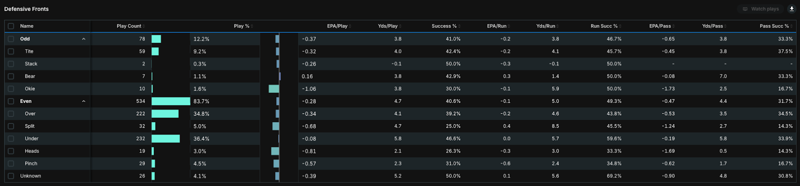 Each of these categories can be expanded to show more detail. For example, the front section expands to show us they are about the same playing Under and Over fronts, and when they do play an odd front it is primarily a Tite front. They don’t play out of an Okie front very much, but have a TON of success when they do, so I know I will want to dive in there for further analysis. Although they play similar total snaps in Under and Over, their EPA per play is much better out of Over. It looks like the EPA per pass is a large culprit in why that is the case. I would want to dive deeper into the pass game when Notre Dame is in an Over front. Why are they more successful in that front? Is it better blitzes? Better people in coverage? As you can see, once you get the first question answered, it easily bleeds into directing the next two steps.