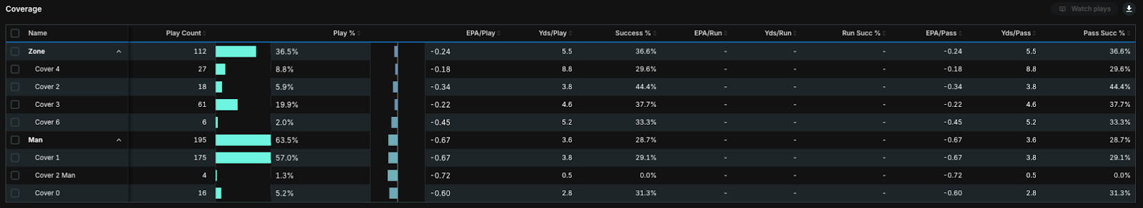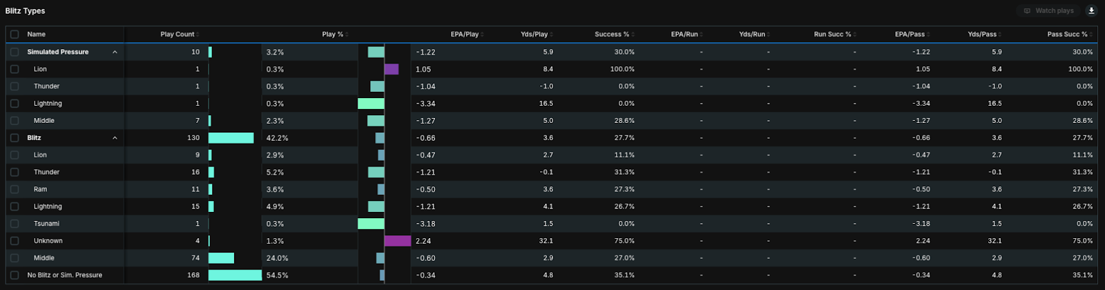 The defensive scheme page is meant to give the user a full breakdown of what a defense does on the field. The initial view breaks down front into two larger categories: odd and even, with column labeled unknown for everything else. Blitzes are broken down into three categories: blitz, simulated pressure, or no blitz. A simulated pressure is bring 4 rushers, while dropping at least 1 defensive lineman into coverage responsibilities. The last section covers coverage; the initial split being man and zone. For each of these categories, users are given summary statistics including total plays, EPA per play, yards per play, success %, and more.