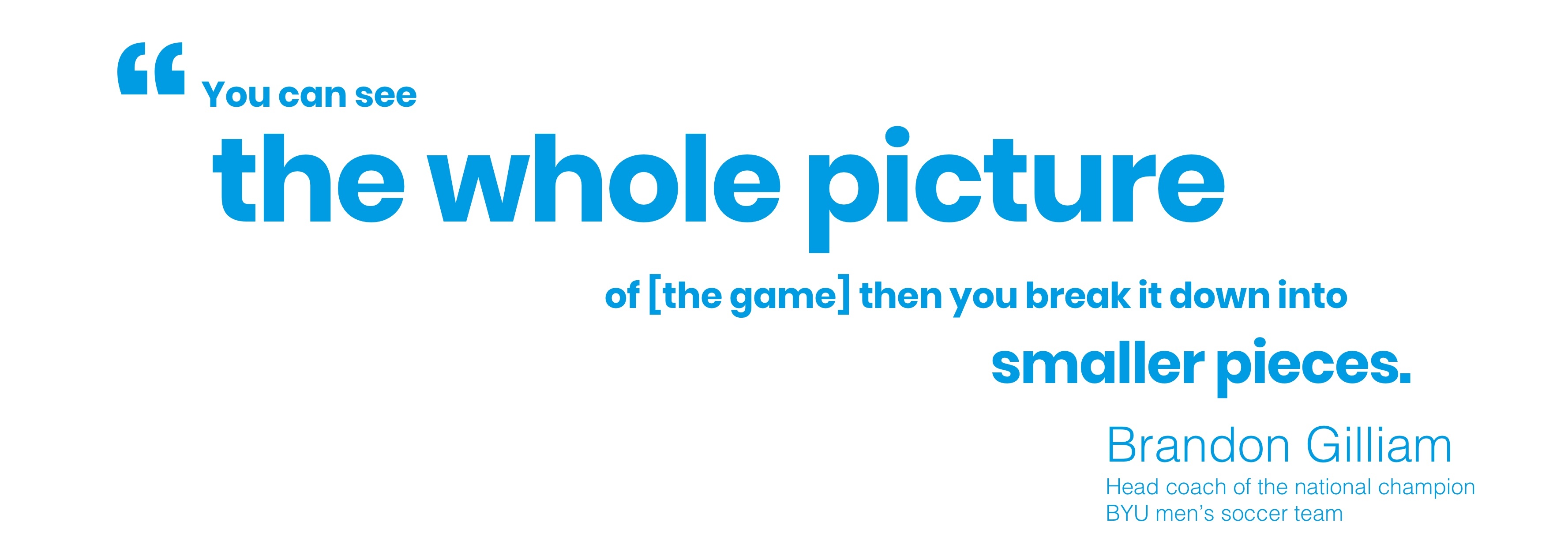 Brandon Gilliam, head coach of the national champion BYU men’s soccer team, agrees. If you break the game into smaller, targeted chunks, athletes are more likely to absorb your lessons.