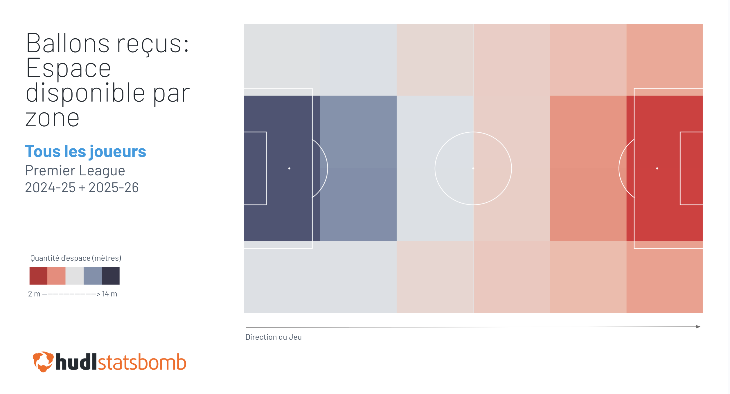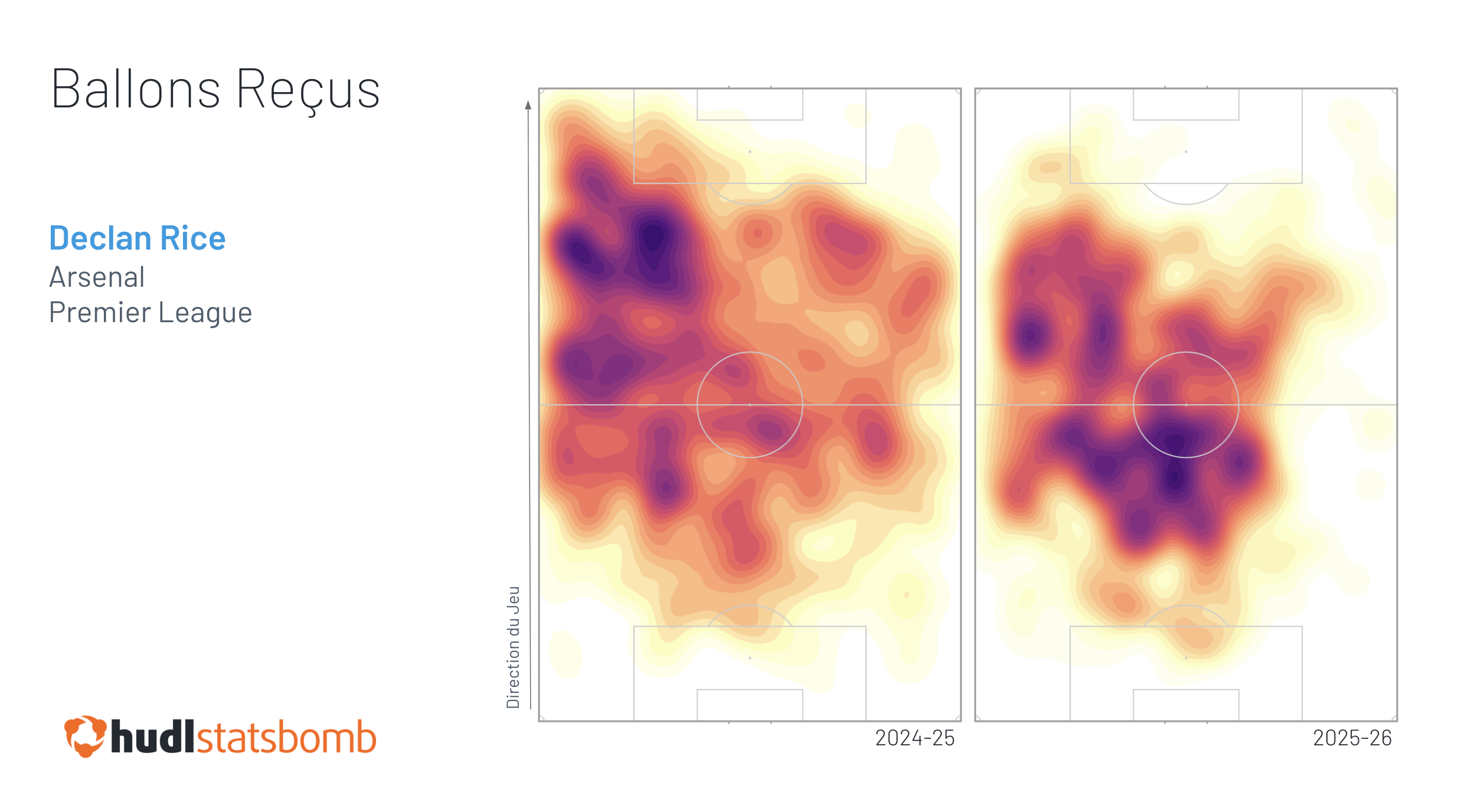 Et si nous cartographions les réceptions de balle de Rice de cette saison par rapport à la saison dernière, il est immédiatement évident qu'il reçoit plus souvent le ballon dans ces zones d’espace. En effet, si nous nous concentrons uniquement sur la zone centrale dans sa moitié de terrain, le pourcentage de ballons reçus dans cette zone est passé de 24% la saison dernière à 39% cette saison.