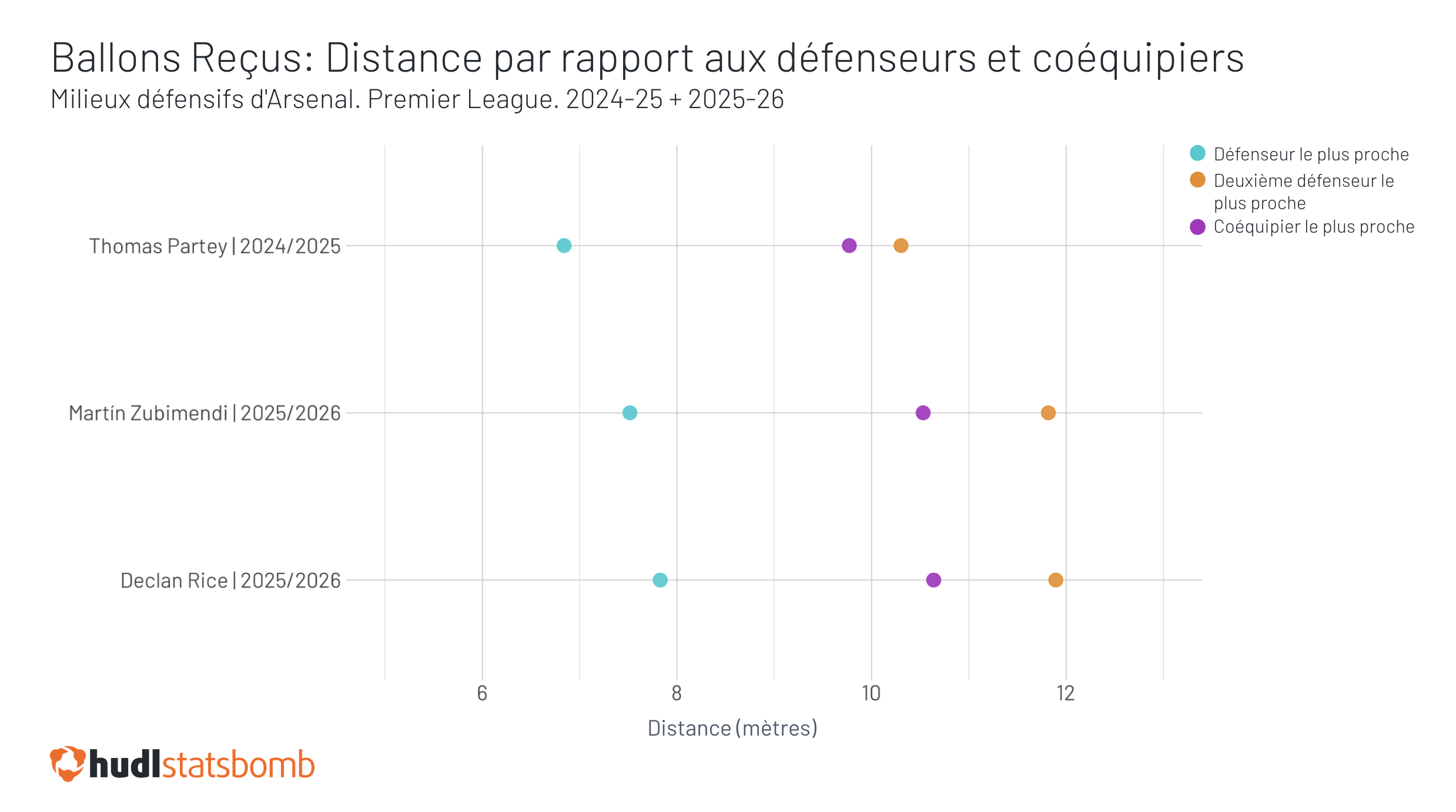 Cela a sans aucun doute contribué à une augmentation de l'espace dans lequel il reçoit le ballon. En moyenne, Rice a 7.82 mètres d'espace autour de lui à la réception — son meilleur total depuis son avant-dernière saison à West Ham, et près d'un mètre de plus que la saison dernière.