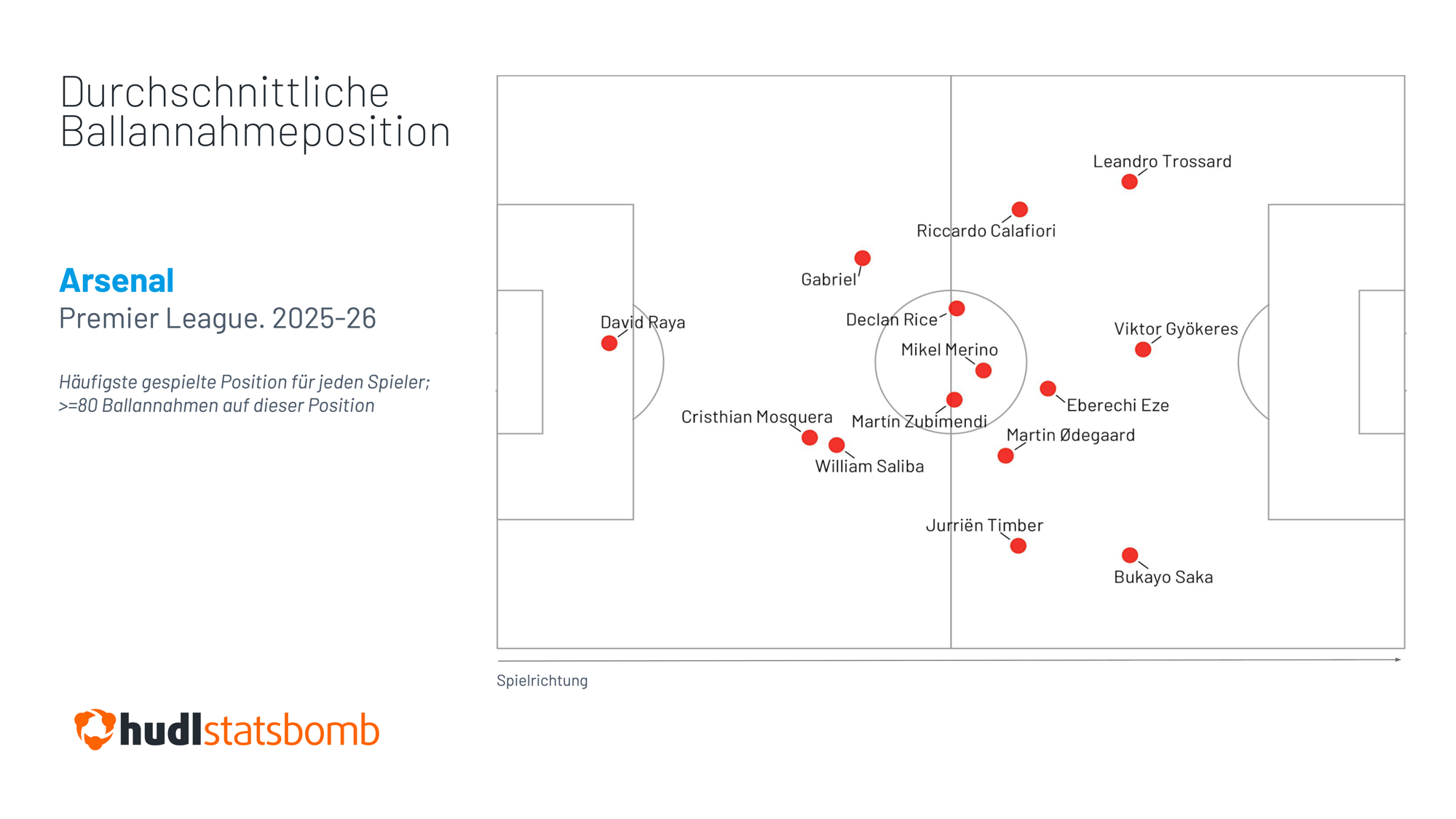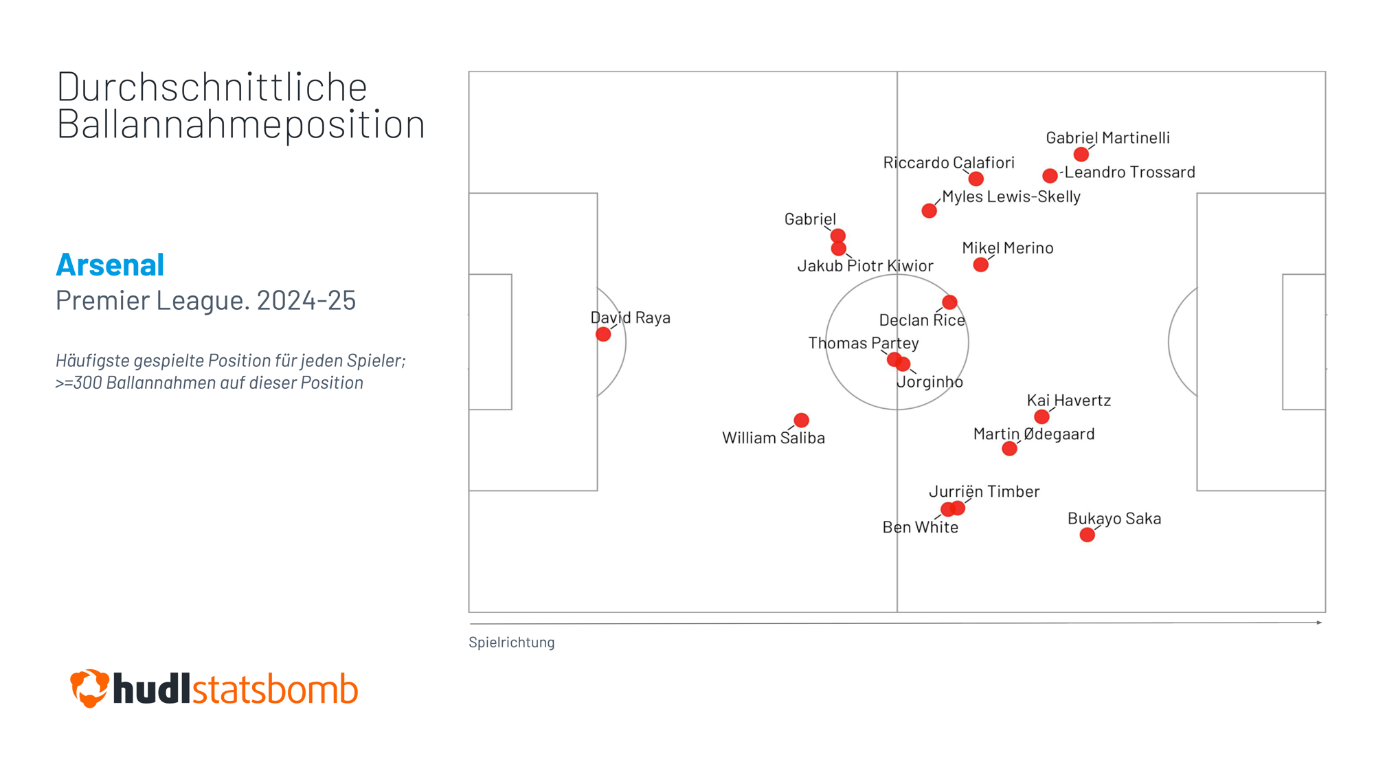 Wenn wir die durchschnittliche Position der Ballannahmen der Arsenal-Spieler in der letzten Saison betrachten, gefiltert nach der Position, die jeder Spieler am häufigsten innehatte…