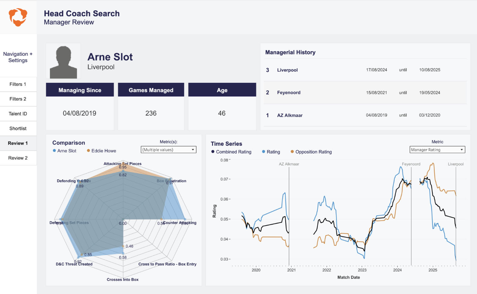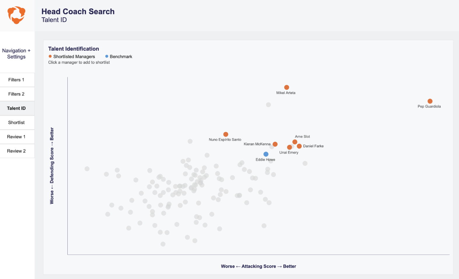These results can be benchmarked against the incumbent manager and more weight can be added to specific stylistic elements that are important to your desired game model, in order to fit the coach who truly fits your needs.