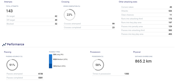 Passing: To achieve favorable possession, our second goal is to attempt more passes than the opponent and achieve extreme accuracy. In 90 minutes, Barcelona attempted a remarkable 770 passes per game with a passing success percentage of 91% (Image 1). My youth team attempted 300 passes (in 60 minutes) with a success rate of 67%, which means we have some work to do.