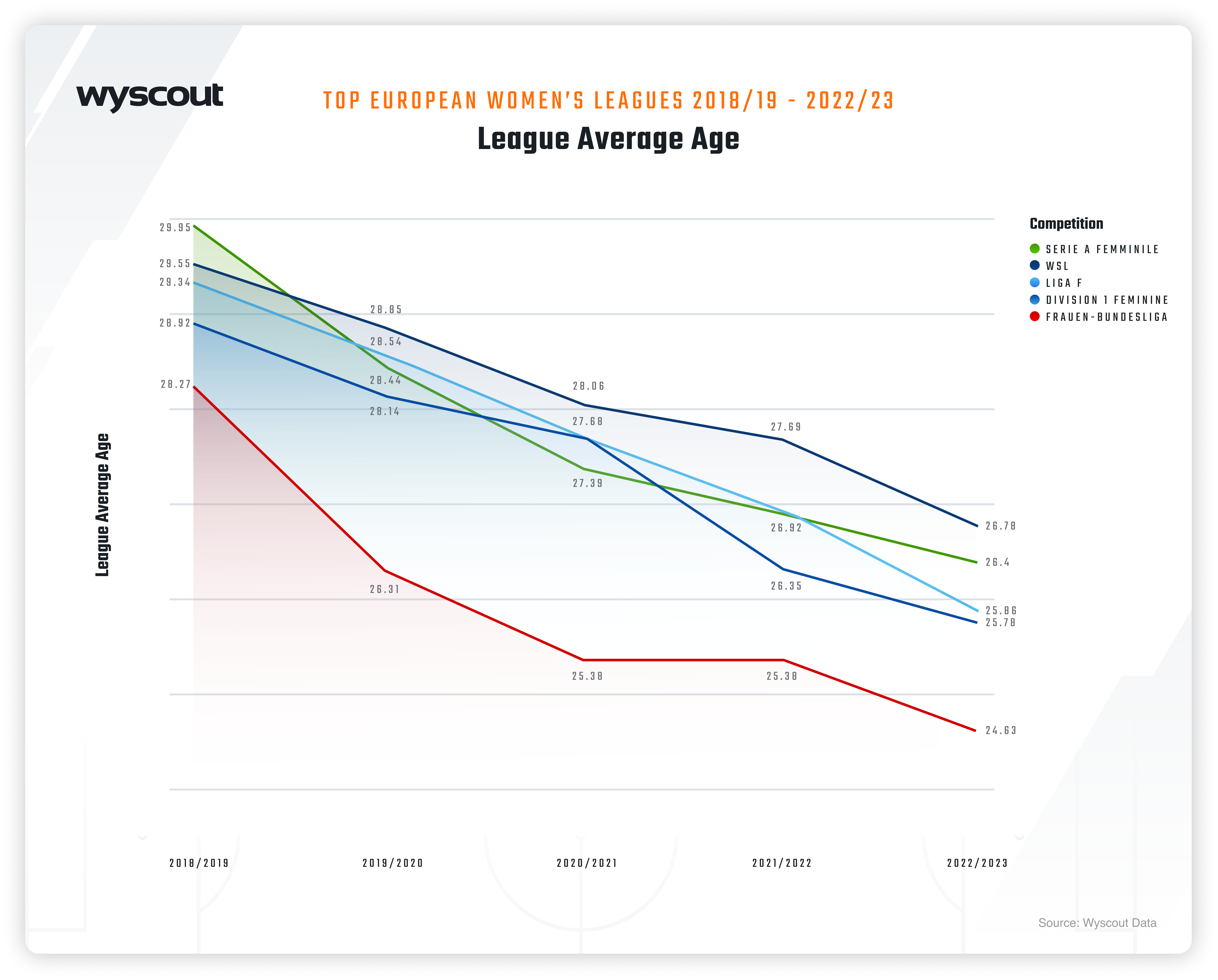 We also see that the German Frauen-Bundesliga ranks as the youngest league, with an average age of 24.63, suggesting that they may be the most willing to trust in youth. It also could provide recruiters with a hint as to where to find the next young star.