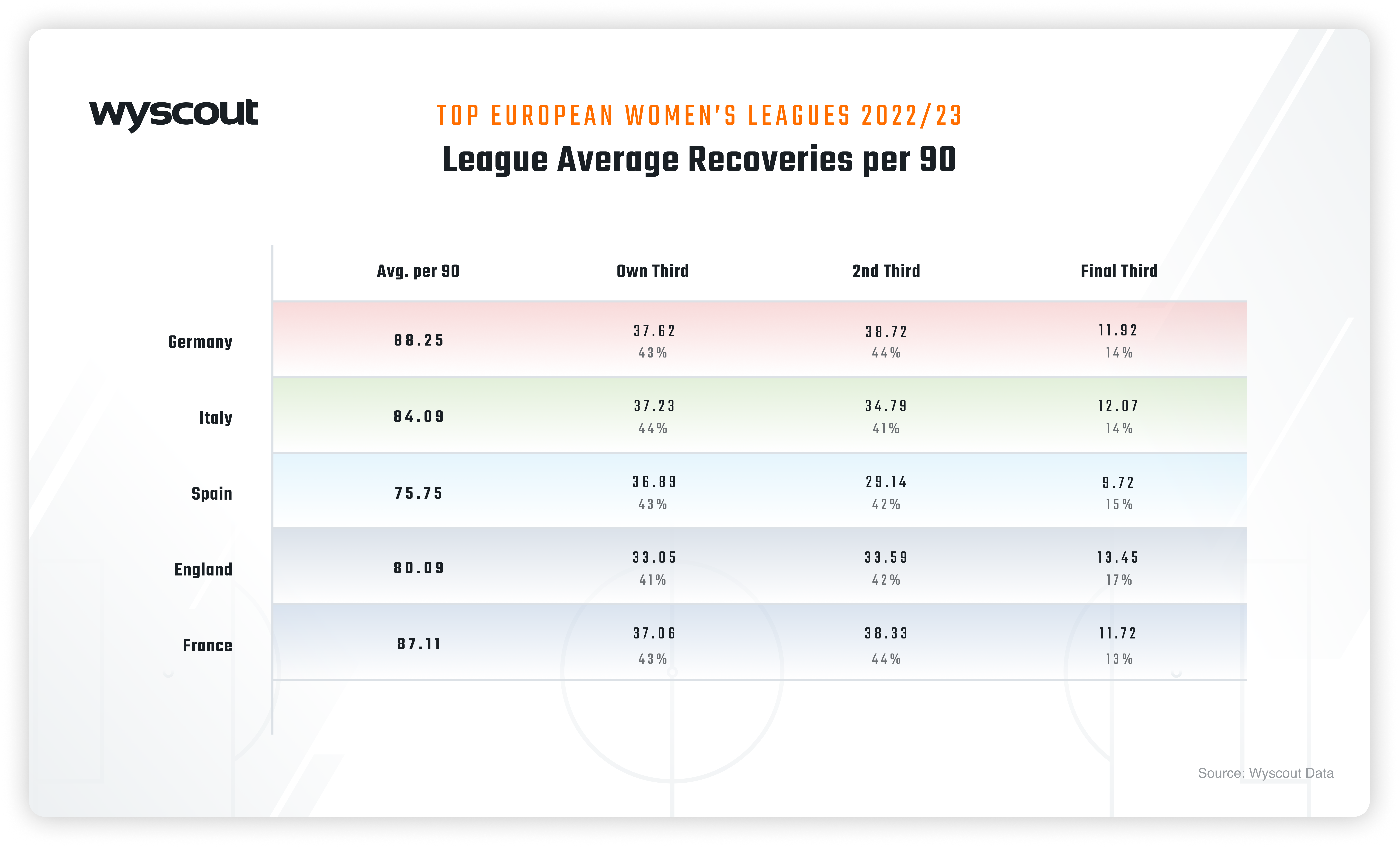 Looking at the average for recoveries per 90 from the 2022/23 season across the top women’s leagues in Europe, we see that Germany and France average the most, recording 88.25 and 87.11 per 90 respectively. This could suggest that there is a more aggressive, intense style of football with typically more turnovers in possession.