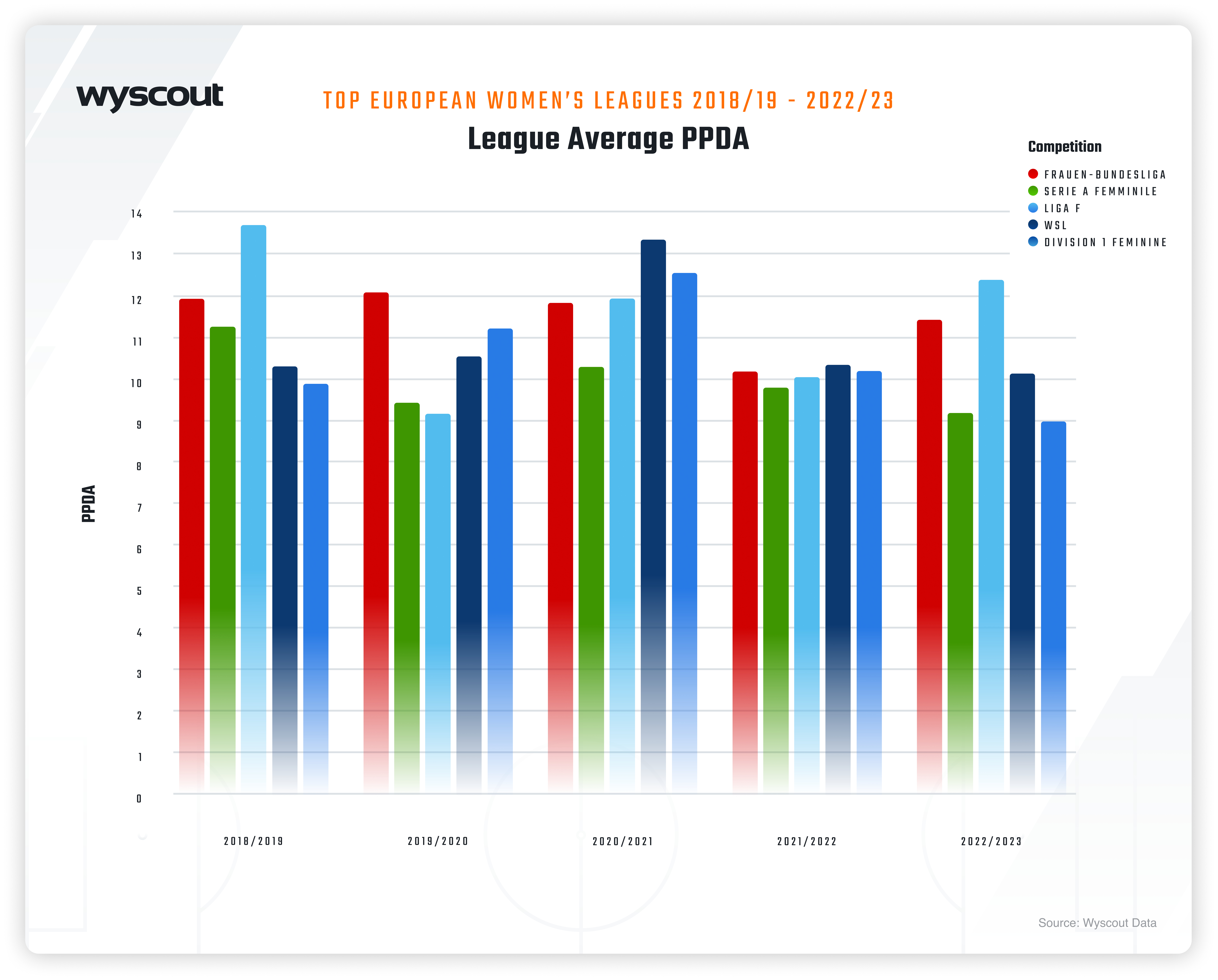 The spike in PPDA in the WSL and Division 1 Feminine in 2020/21 is an interesting outlier but could potentially be explained as a response to COVID, with teams not at the peak physical conditions through disruptions to training schedules and player availability.