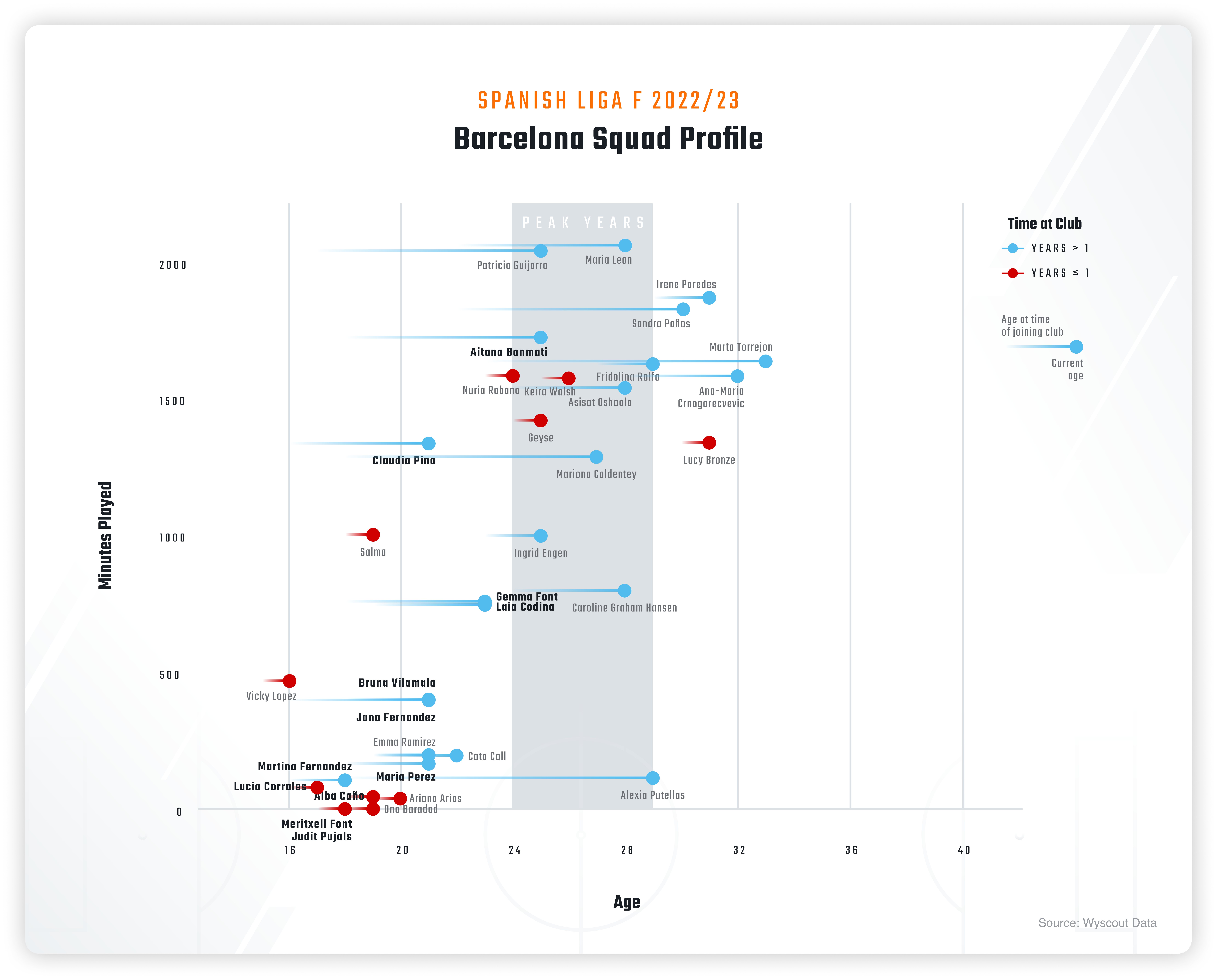 We can see that Barcelona have a good mix of experience, players in their prime and young prospects ready to step up and play a bigger role. The majority of Barcelona players playing most minutes are in the traditional 'peak years' and there are a whole host of young players waiting in the wings, all pointing to a very healthy squad balance and one that is not in need of major renovation any time soon.
