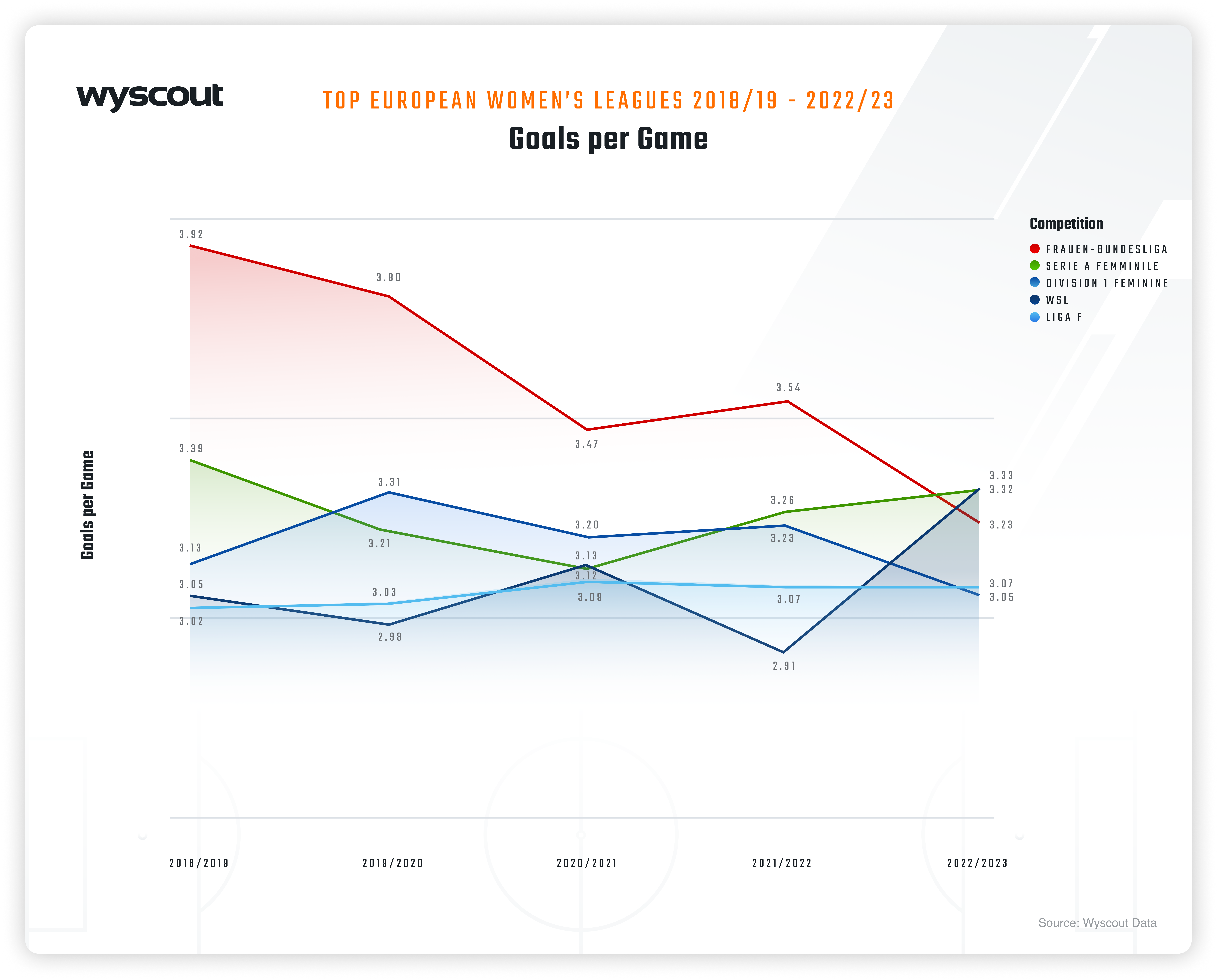 The WSL is the league with the most notable rise in goalscoring, from 3.05 up to 3.33, with Serie A posting a comparable 3.32 goals per game in the most recent 2022/23 season. Spain's Liga F has seen a slight rise too, but has typically been lower than other European leagues.