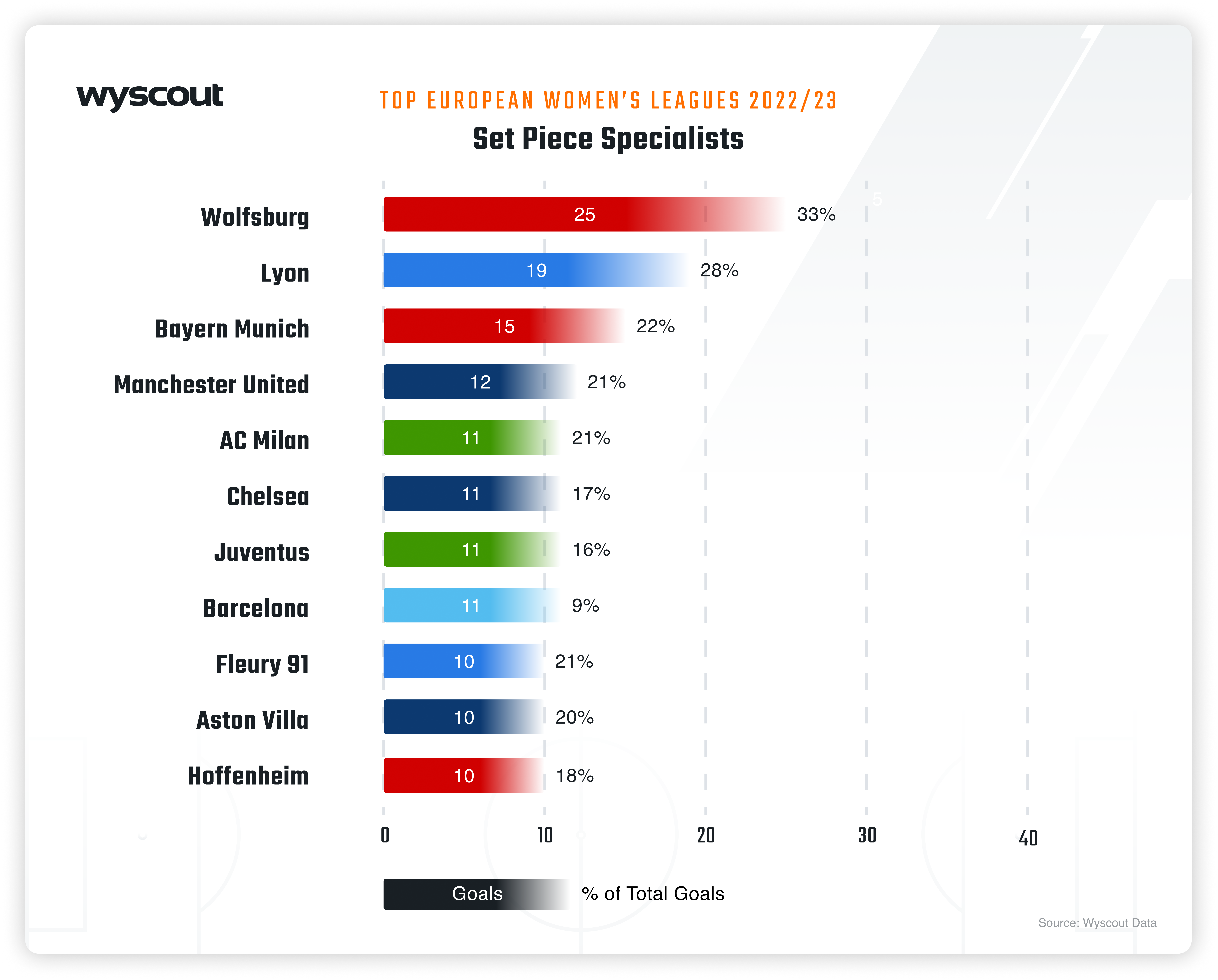 Set pieces are increasingly becoming an area where teams can find marginal gains through data and video. Analyzing the 2022/23 season, we can see that Wolfsburg top the charts in terms of maximizing goal return from set pieces, with a third of their league goals coming from this source.