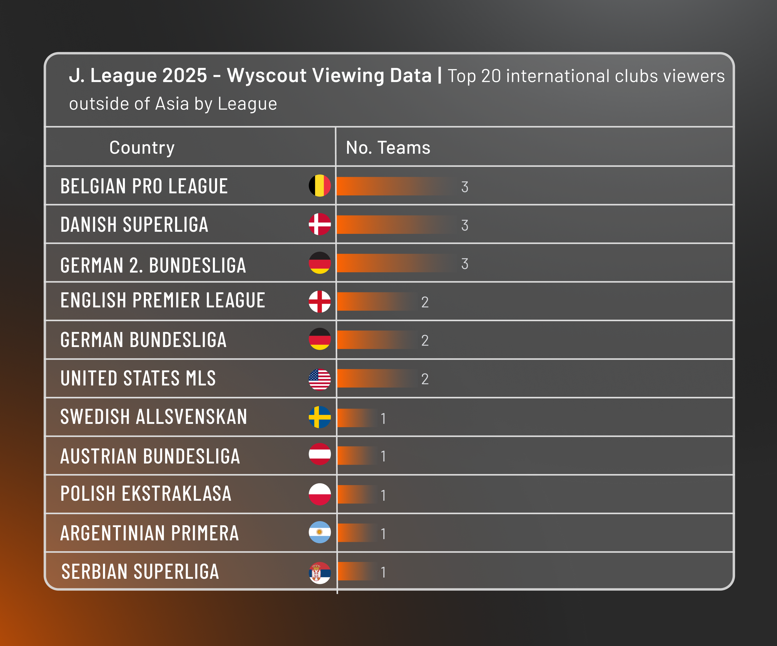 A look at Wyscout viewing data, shows that over the past three years Belgian clubs have consistently had the highest numbers of clubs among the most frequent viewers of the J.League.