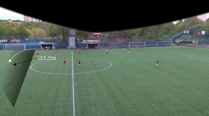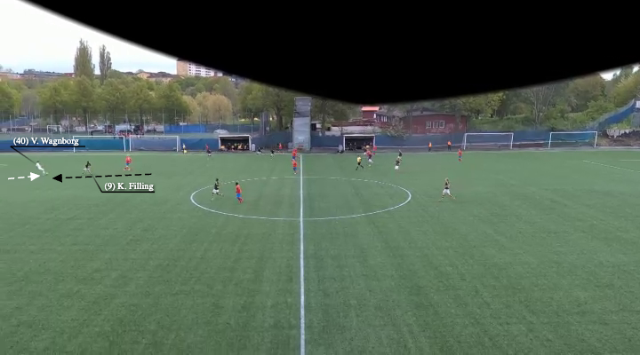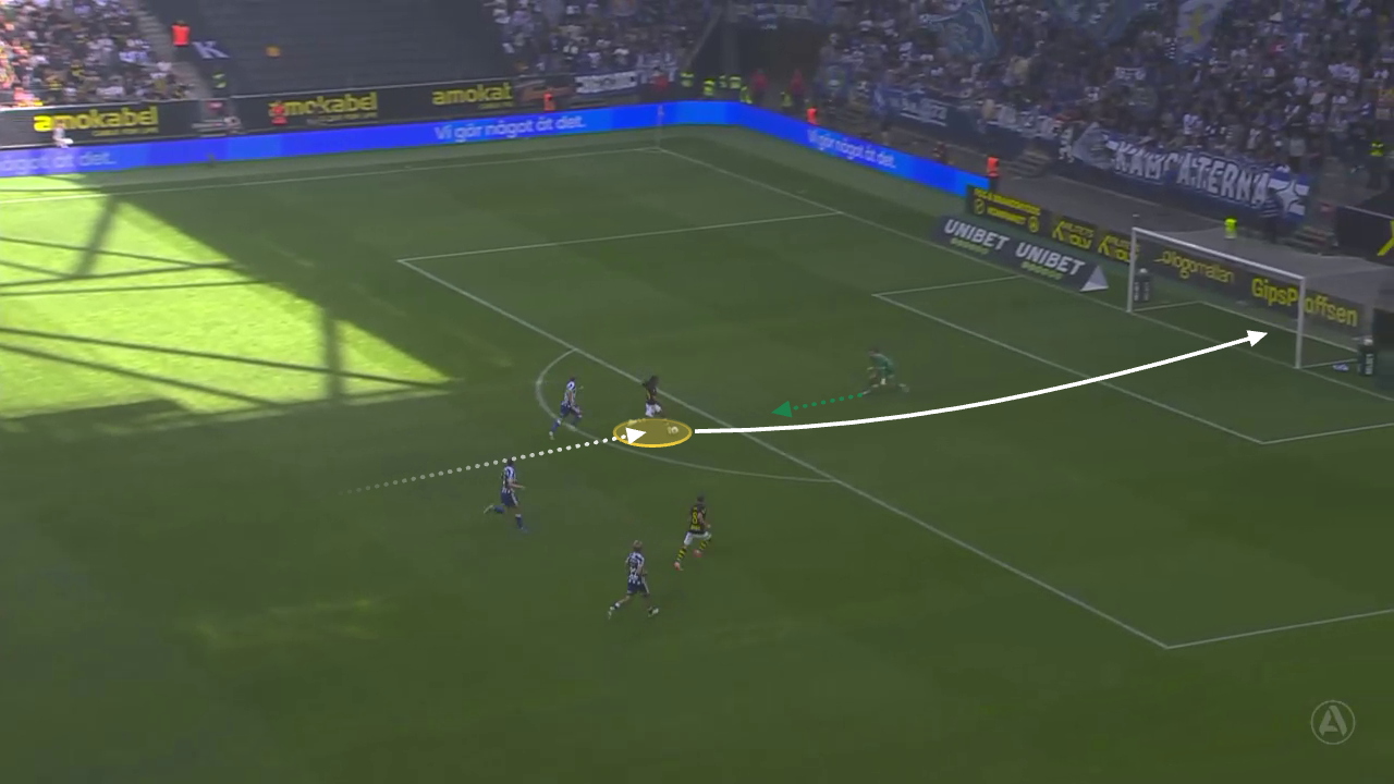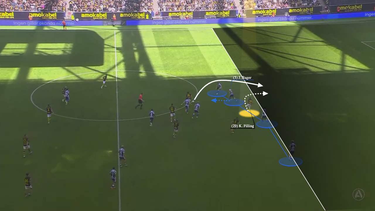 In the image above, we see Filling playing on the last line with space in behind. Like every good number nine, he makes a small decoy step forward to trick the defender Jonas Bager into thinking he is dropping deep. Bager steps forward, and this seemingly minor action creates just enough space between the two centre-backs for Filling to pounce. He curves his run in the space left by Bager and stretches the game vertically looking for the ball into the space behind.