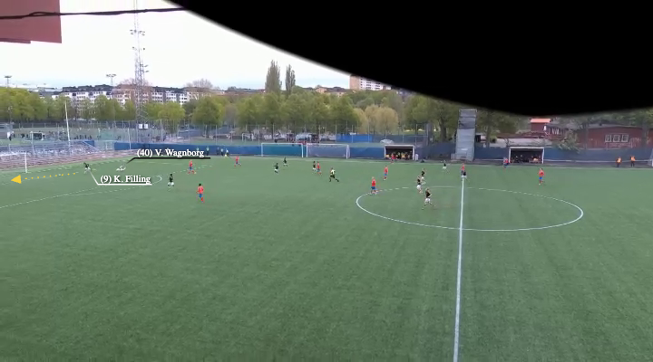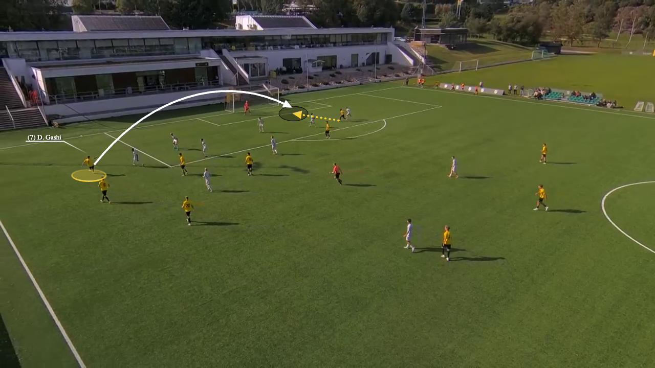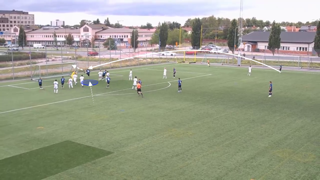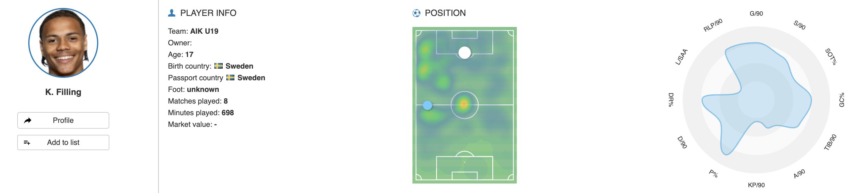 Watching footage of Filling for the U19s, he is a striker who plays on the shoulder of defenders looking to get on the last line of defences and break into space. For example, against Helsingborgs IF U19s, a backpass causes chaos for the opponents due to Filling’s pace and pressing intent, unbalancing the defence and causing the goalkeeper to take a risk flying off his line to close down the space.