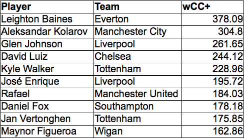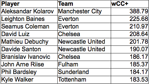 These leaderboards also demonstrate one of the limitations of the statistic. It can only really be used to compare players in the same position. As expected there is a much greater range for defenders than midfielders and forwards, because the denominator becomes steadily higher as we move further up the pitch. This also reflects common sense, there is a bigger range among defenders’ chance creation, who all have different roles in terms of attacking intent, than there is amongst those of forwards whose primary goal is to create chances. For example Kolarov doesn’t create more chances than Suarez despite having a higher wCC+, he just creates more relative to the average defender than Suarez does relative to the average forward.