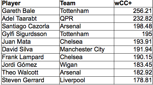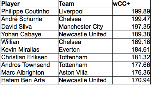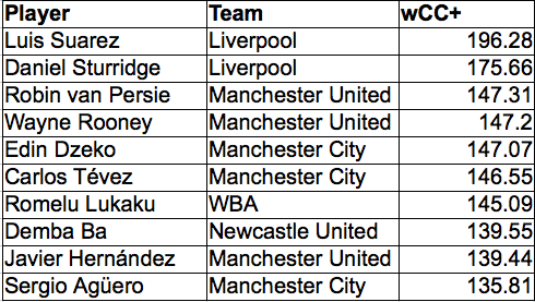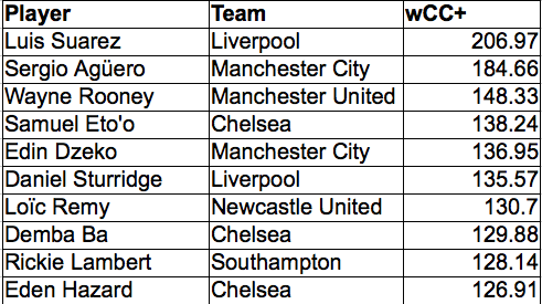 That being said these leaderboards show how much better Luis Suarez has been than every other forward in the Premier League over the last two years. It is also nice to see this statistic reflect how vital Coutinho was to Liverpool’s 2013-14 season. The other stand out to me was Wayne Rooney’s consistency and impressive numbers over the past two years with wCC+ of 147 and 148. These production numbers fall in line with some of the other work on Statsbomb looking at Wayne Rooney’s career.