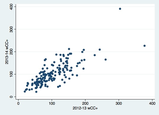 Looking at the 2012-13 and 2013-14 Premier League season the r^2 value between wCC+ from one season to the next is 0.78. The scatter plot below shows the tight season to season trend in wCC+.
