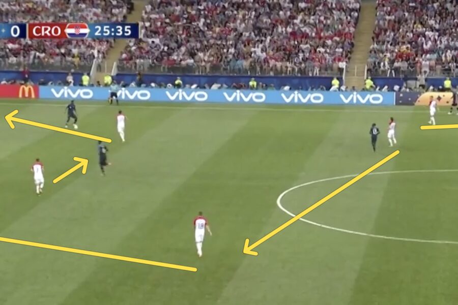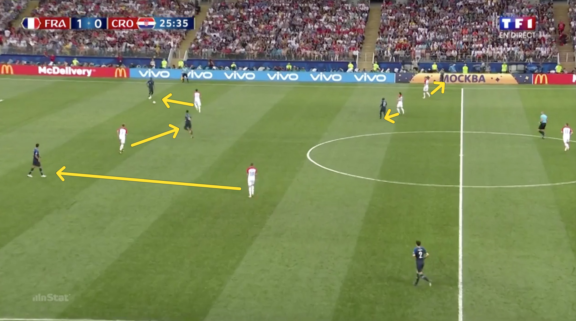 Les trois attaquants croates se sont efforcés de faire reculer la France sur un côté, laissant le défenseur français libre sur le côté opposé, ce qui a donné lieu à des récupérations dans la zone défensive française.