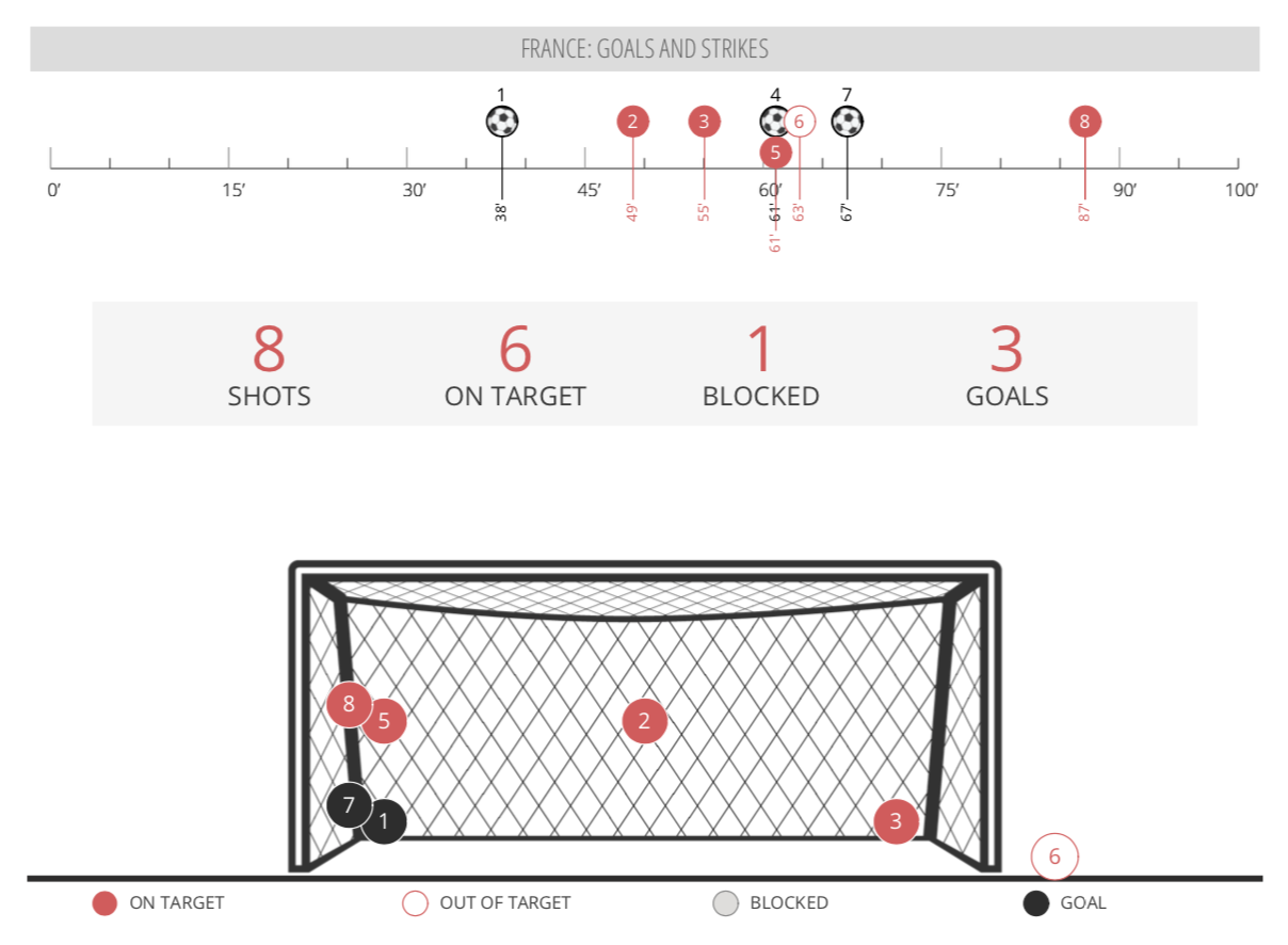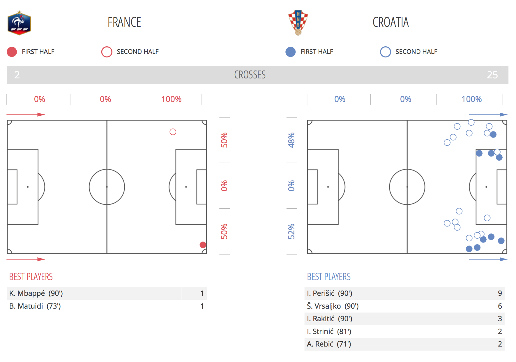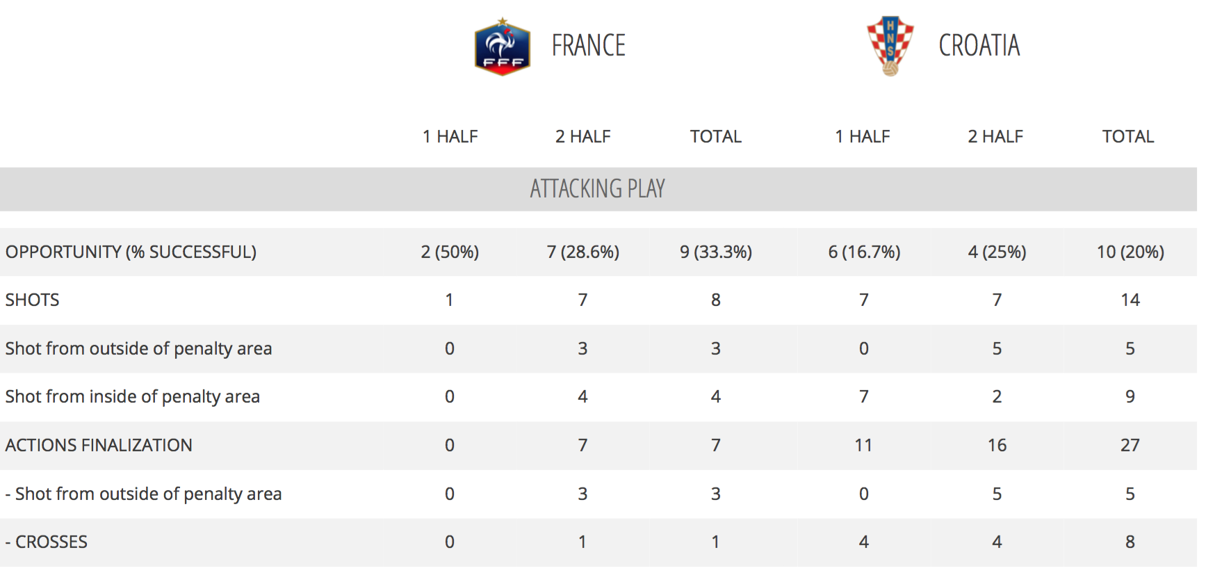 La Croatie a également conservé le ballon en moyenne 3,2 secondes de plus que les Français sur un temps total de possession identique. Au cours de la première mi-temps, la Croatie a pénétré 45 fois dans la troisième moitié du terrain, contre seulement sept pour la France.