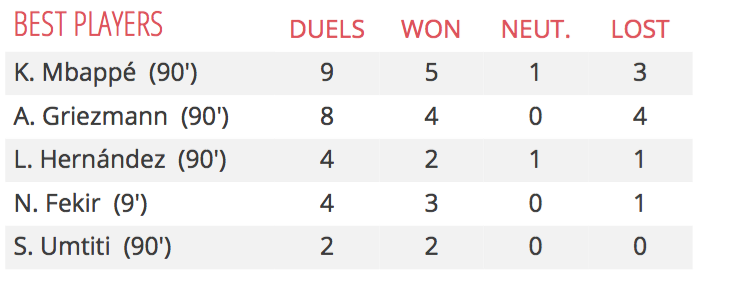 Mbappé a remporté plus de la moitié de ses duels, il est le joueur qui en a gagné le plus au cours du match.