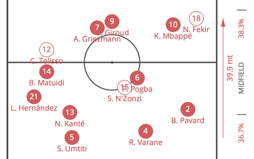 En ce qui concerne les positions des joueurs français durant le match, Mbappé s’est positionné en moyenne plus haut que ses coéquipiers (y compris Giroud) sur le terrain, tandis que Matuidi a passé plus de temps dans son propre camp.