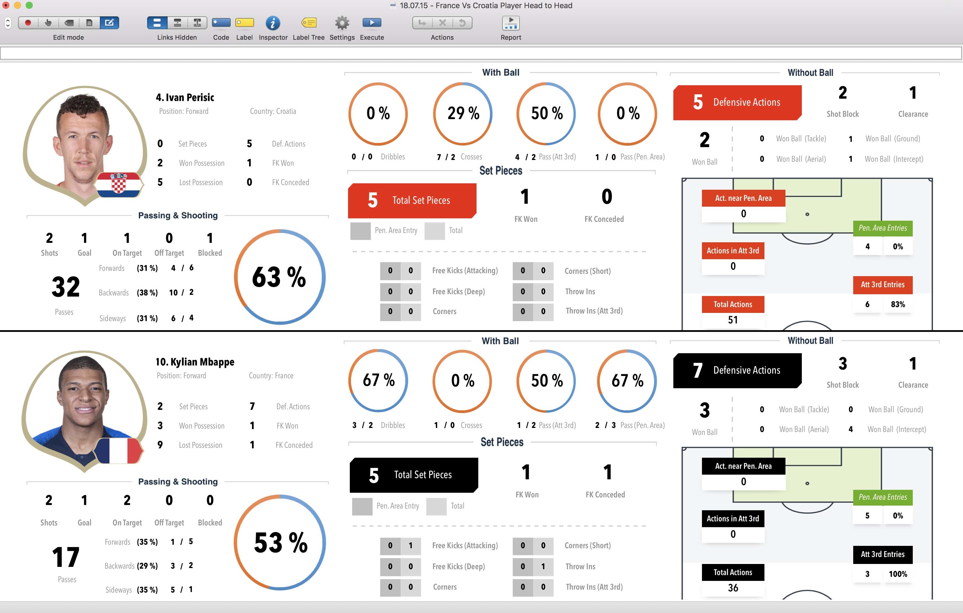 La fenêtre de comparaison de notre logiciel Sportscode ci-dessous indique que même le joueur exceptionnel qu’est Ivan Perisic a été surclassé par Mbappé, qui a livré une performance de très haut niveau.