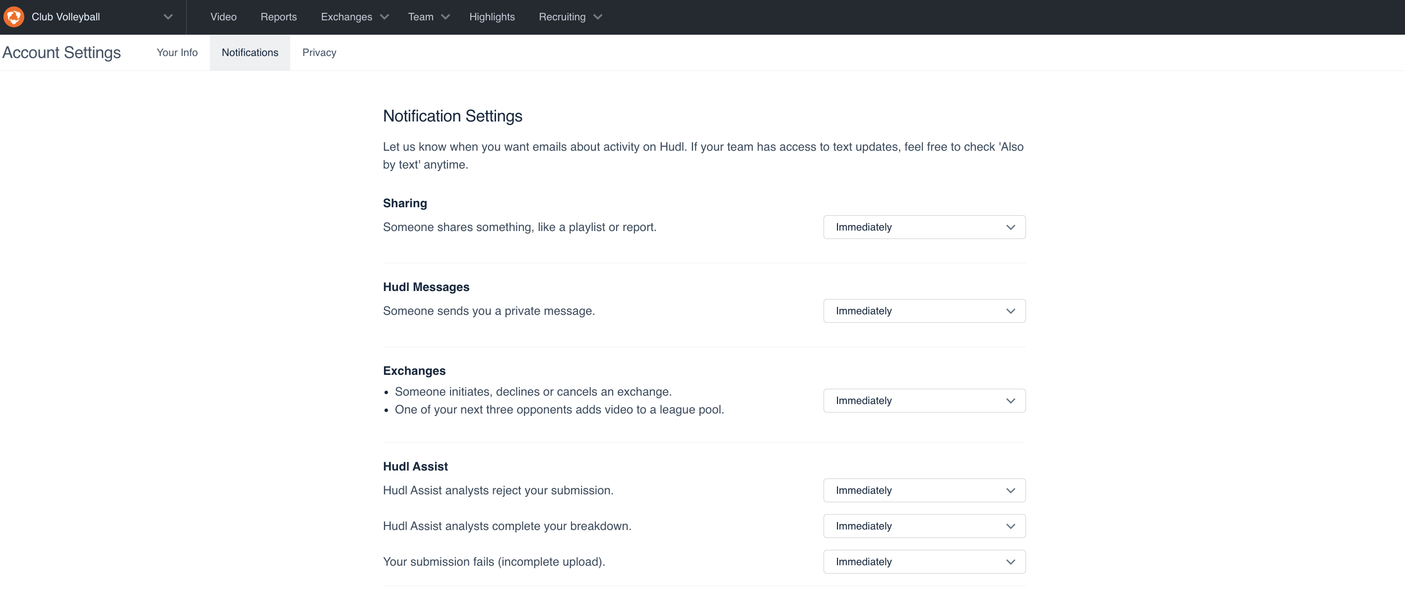Be sure to never miss out on notifications from team members and coaches. Within the Notifications tab, check all your notifications settings. Let us know when you want emails about activity on Hudl.