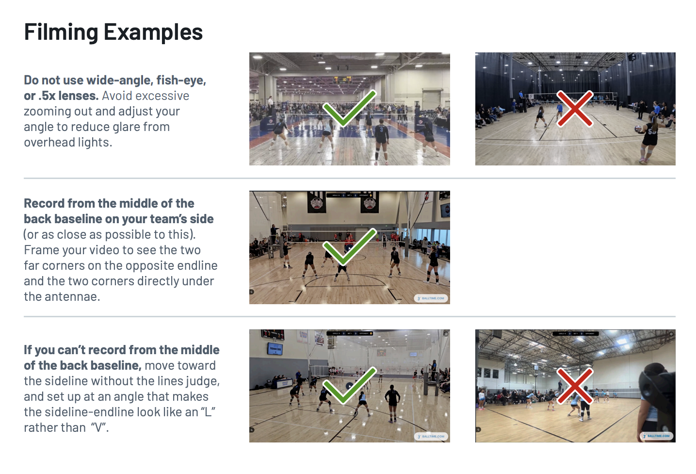 Record from the middle of the back baseline on your team’s side (or as close as possible)