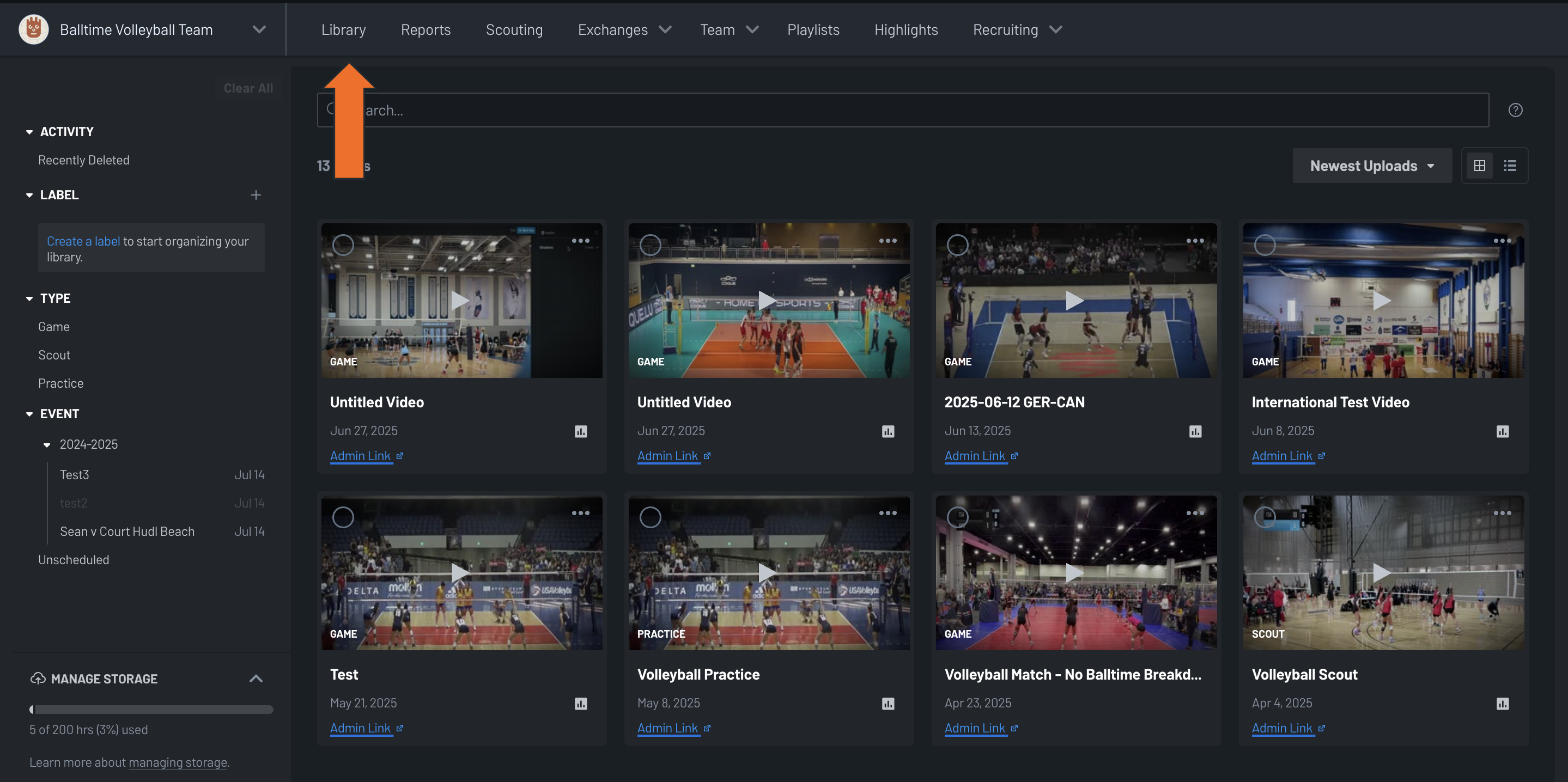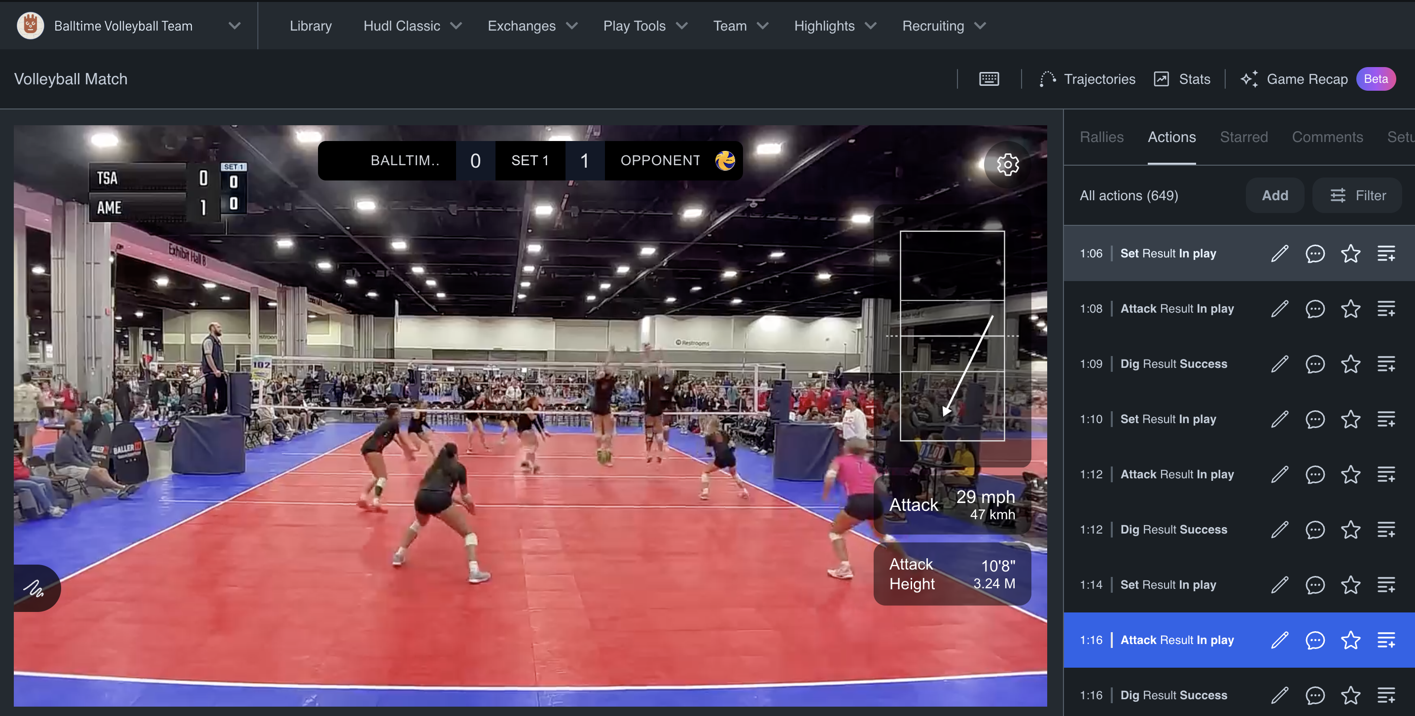 If you’ve used Balltime previously, you can access previously-uploaded video by going to the Library tab. When you open the Video Player, your film is already organized and ready to review. Use the filters to instantly find moments that match exactly what you're looking for—whether it’s kills, service errors, or a specific rotation.